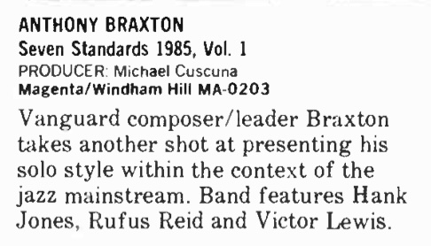 | Record Reviews: Seven Standards 1985, Volume 1. Cadence, 11:71. | 1985-6 |