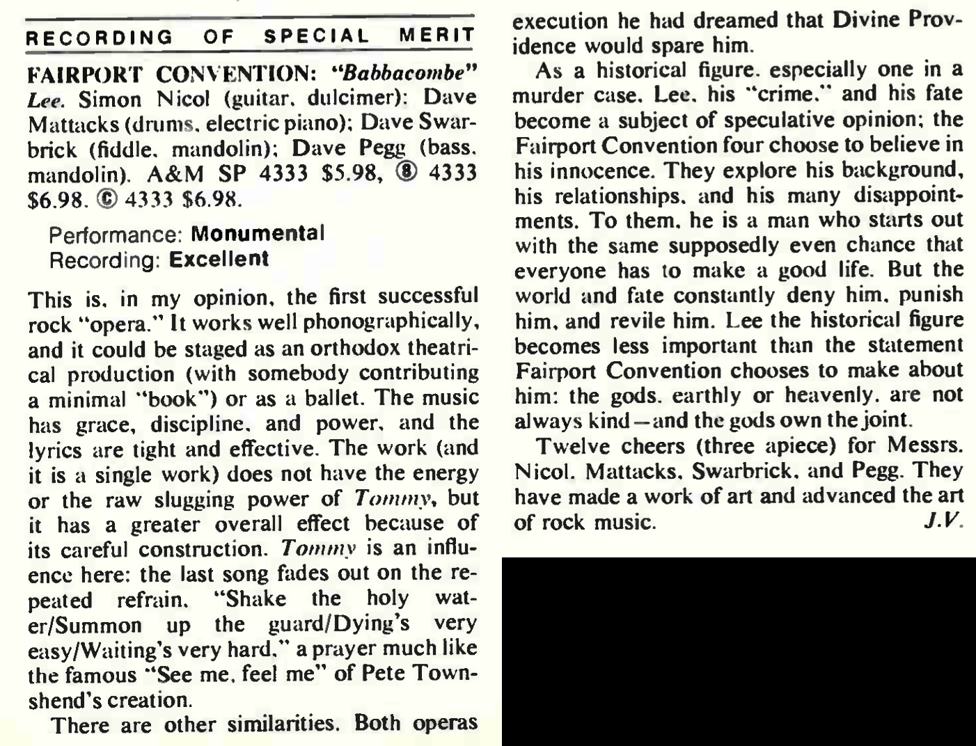 | Babbacombe Lee (SP 4333) review. Joel Vance. Stereo Review, 29:92. |