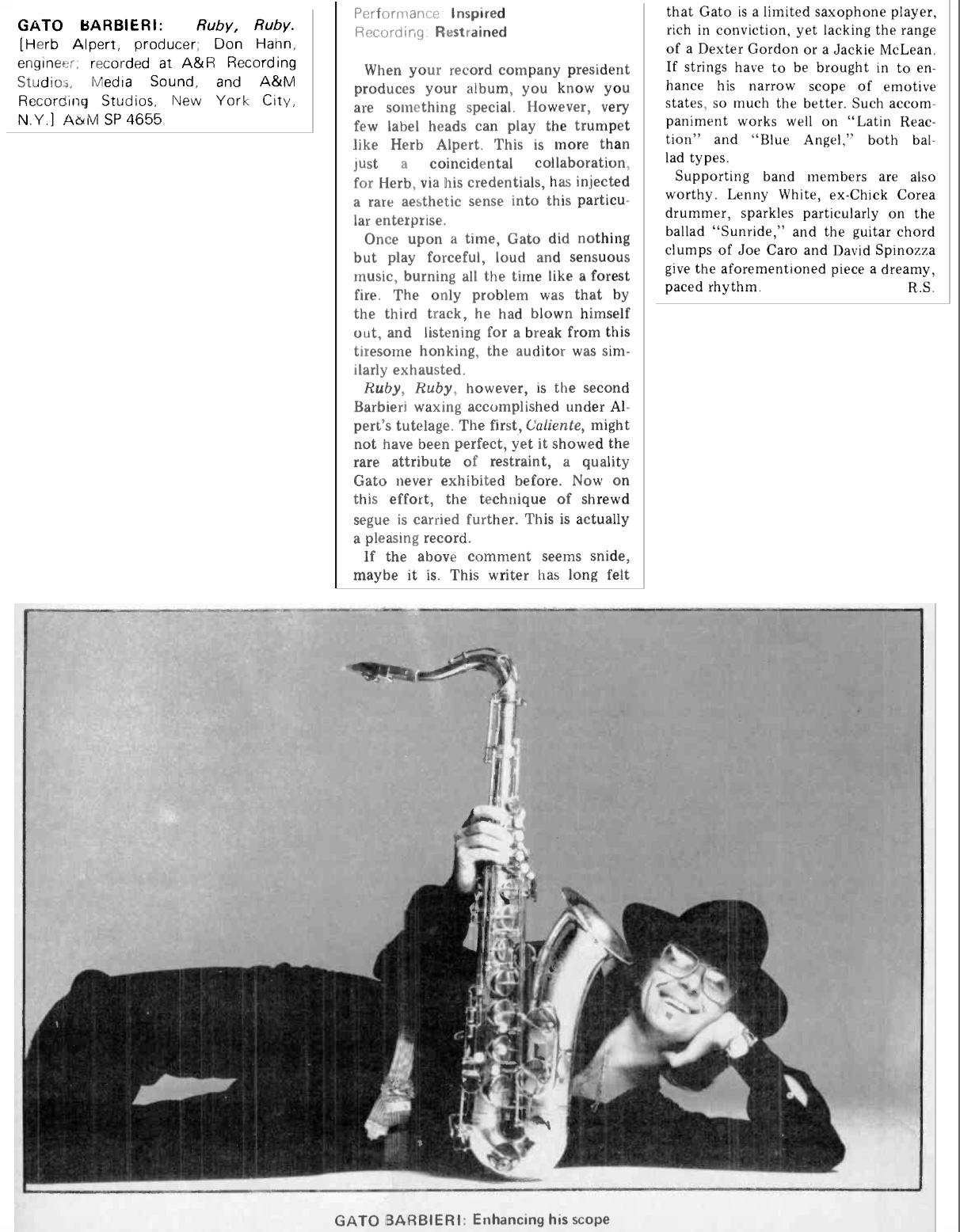 | Newport Jazz: Gato Barbieri Is Irresistible. New York Times. | 1977-7-3 |