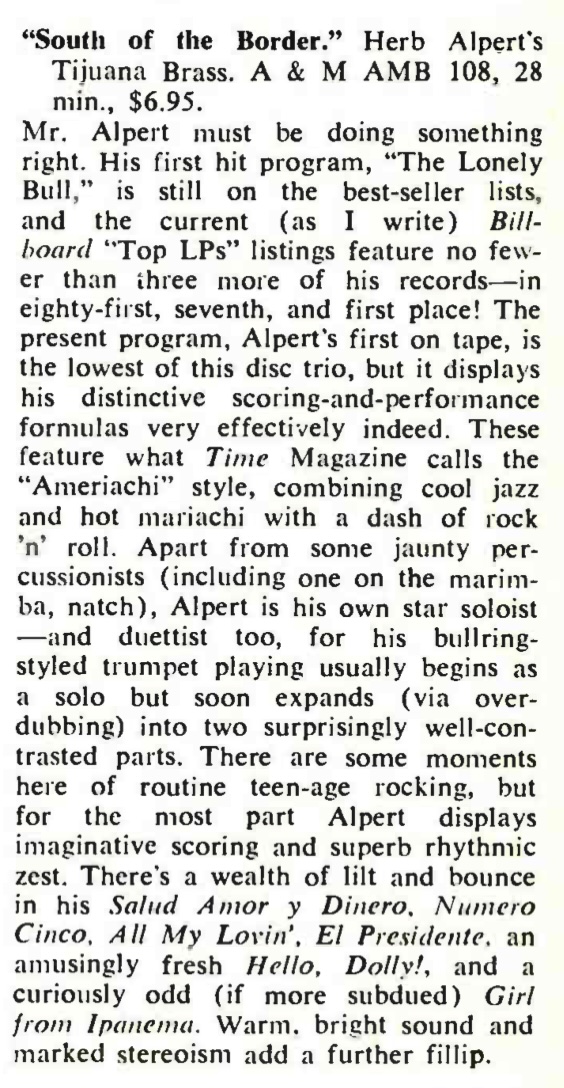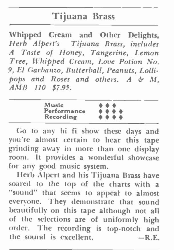 | Whipped Cream and Other Delights (SP 4110) review. R.E. Tape Recording, 44. |