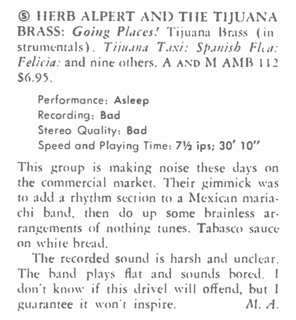 | Alpert & Tijuana Brass Going Places in England. Billboard, 78:10. |