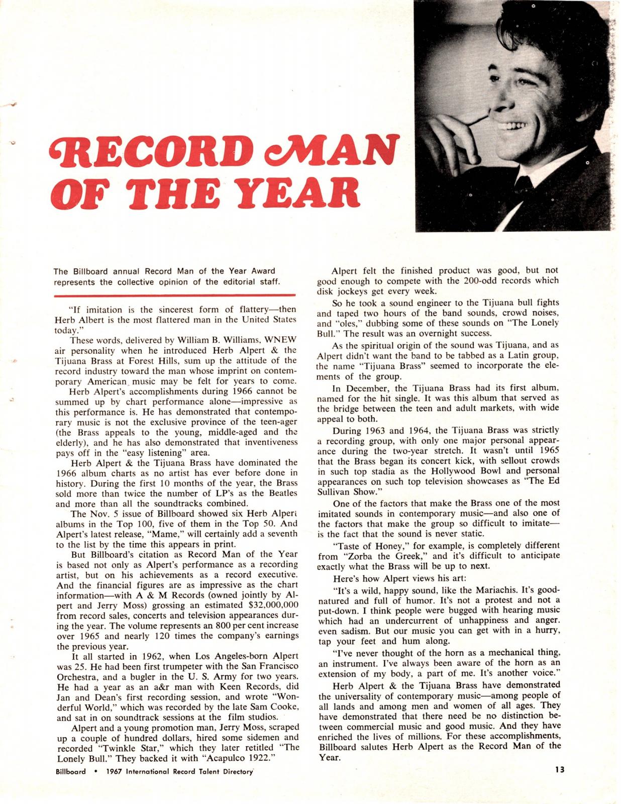 | Will Success Spoil Herb Alpert? Washington Post, L9. | 1967-2-5 |