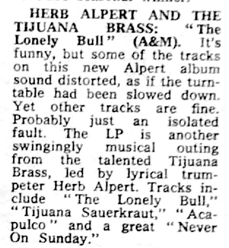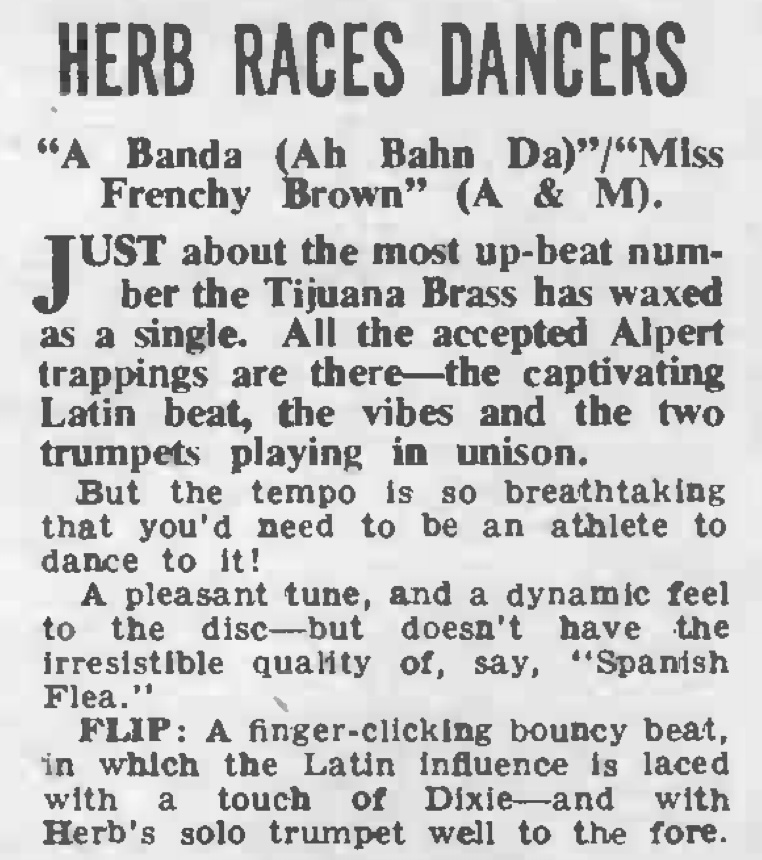 | Alpert's Tijuana Brass Answer to Rock 'n' Roll. Gene Handsaker. Meriden (CT) Morning Record, 6. |