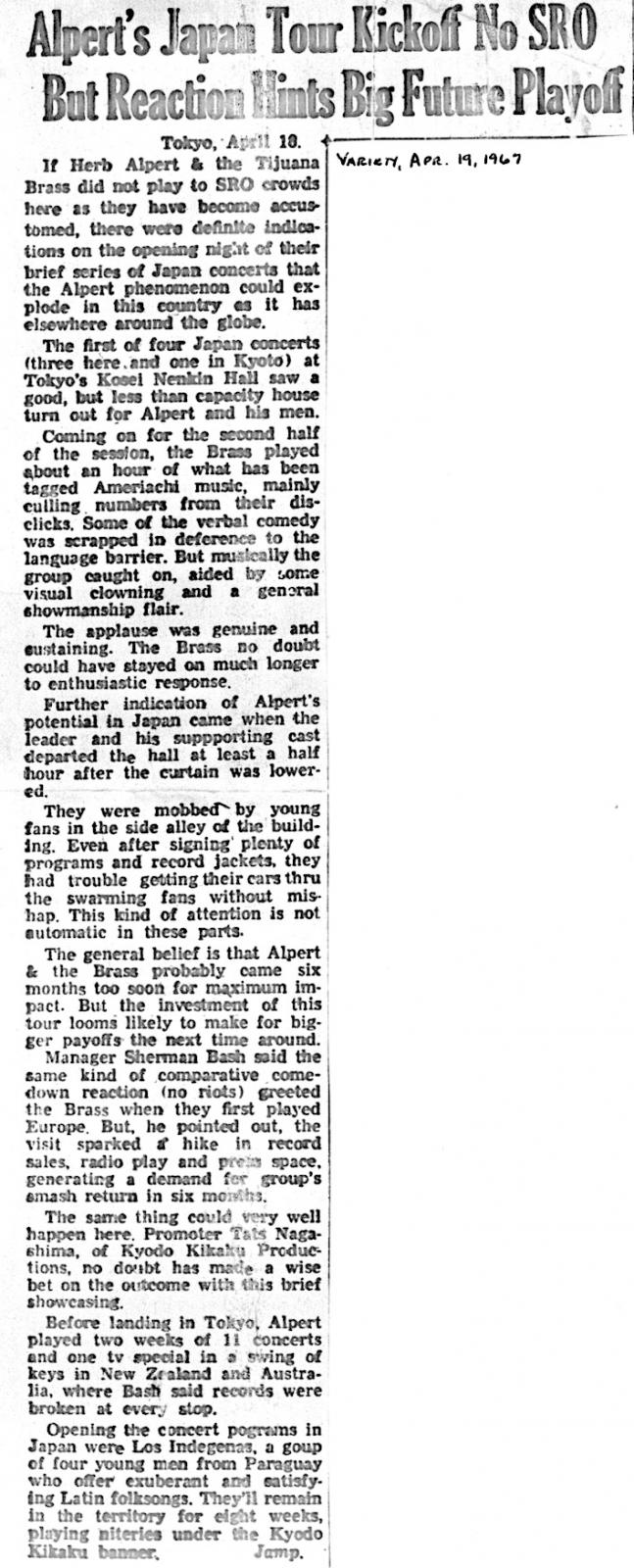 | Herb Alpert's Music Is Lasting. Mike Dungjen. Coshocton (OH) Tribune. | 1967-5-19 |
