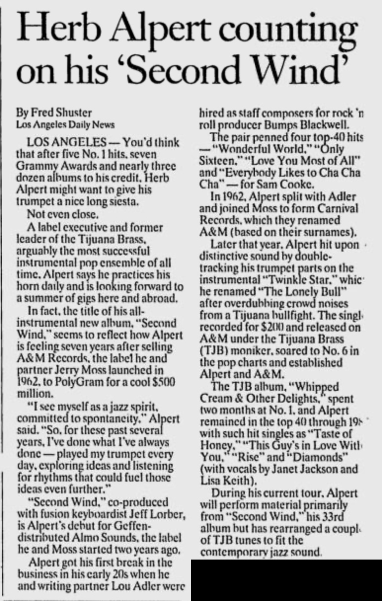 | Jazz-Pop Hero Alpert Getting His 'Second Wind.' Boulder (CO) Daily Camera. | 1996-5-5 |
