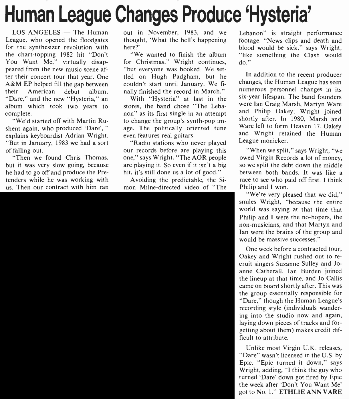 | Human League Changes Produce Hysteria. Ethlie Ann Vare. Billboard, 96:36. |