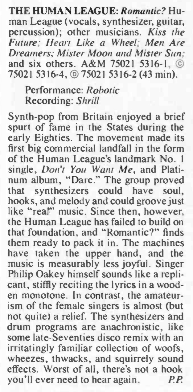 | The Human League (Palladium, New York). Variety, 307:70. | 1982-5-26 |