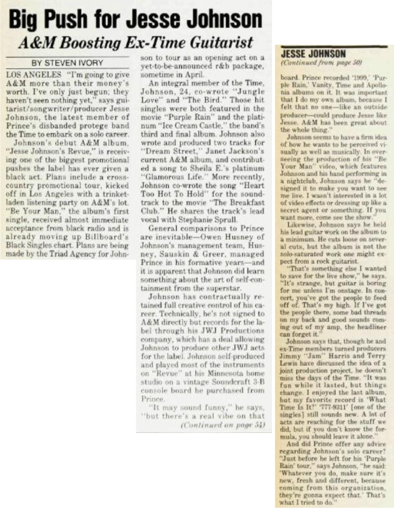| Big Push For Jesse Johnson: A&M Boosting Ex-time Guitarist. Steven Ivory. Billboard, 97:50. |