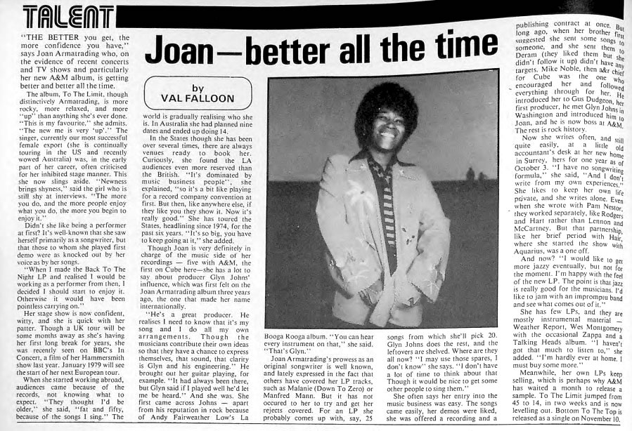 | Joan Armatrading on the Spot. Phil Sutcliffe. Sounds. | 1980-7-26 |