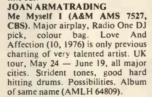 | I Second That Emotion: Joan Armatrading. Phil Sutcliffe. Sounds. | 1976-8-7 |
