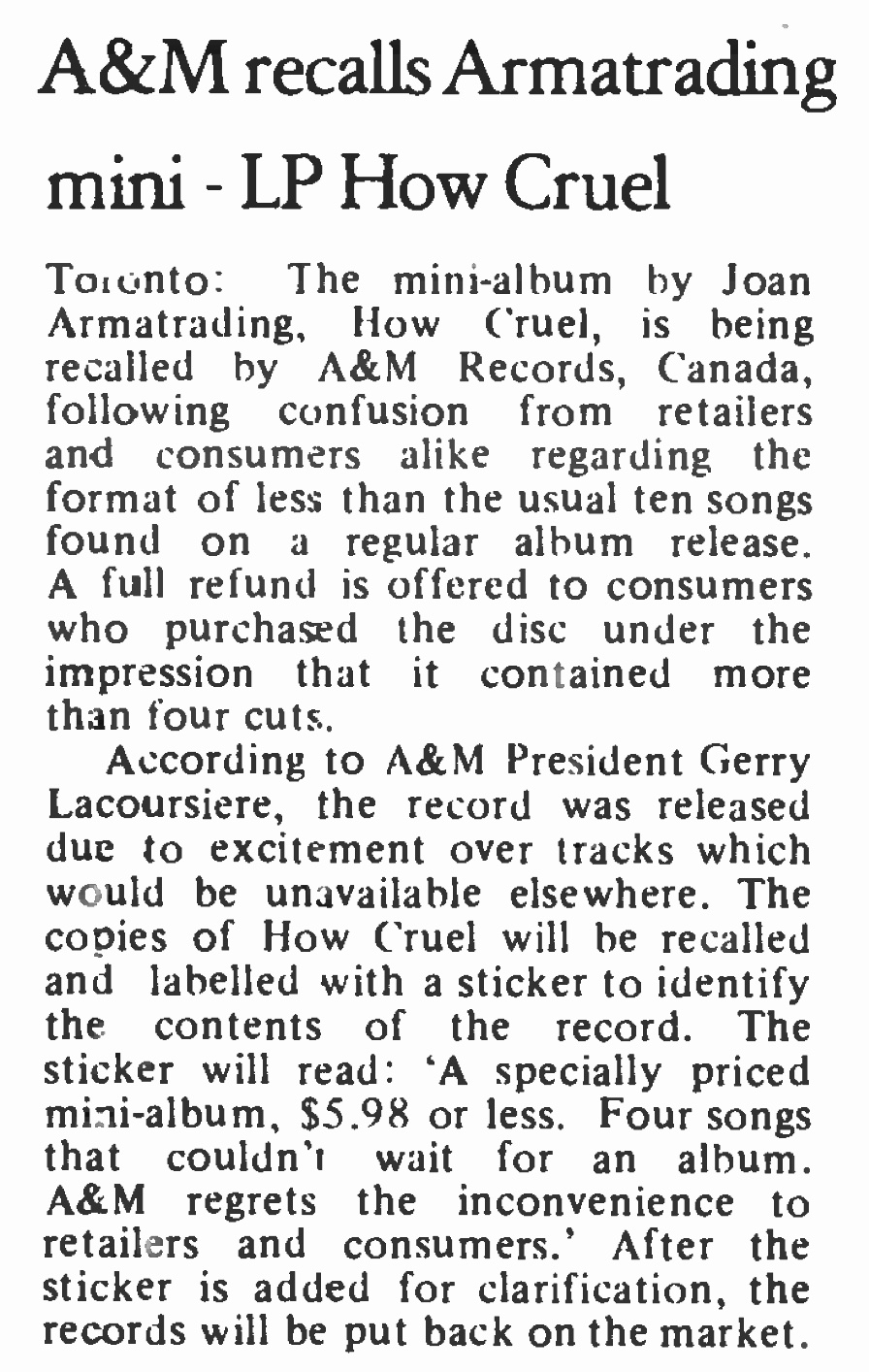 | A&M Recalls Armatrading Mini-LP How Cruel. RPM. |