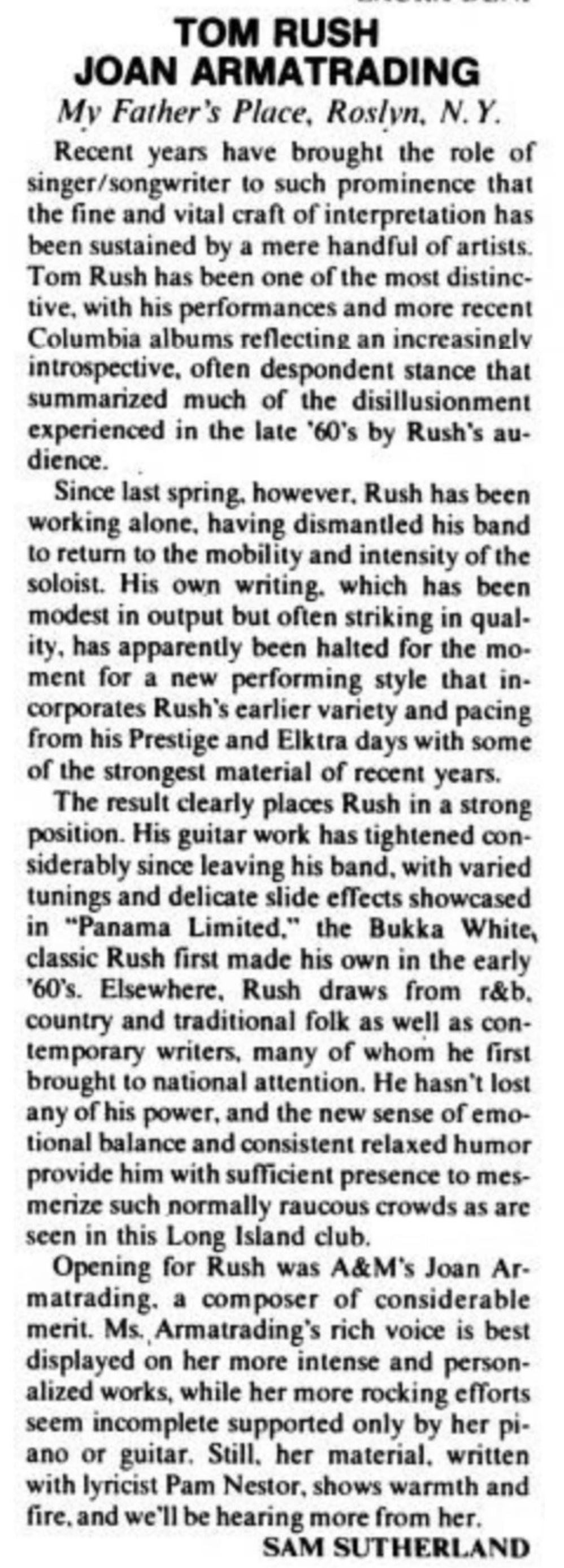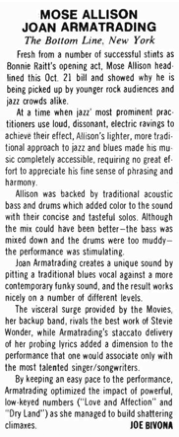 | Music: Joan Armatrading Sings. John Rockwell. New York Times. | 1979-7-28 |