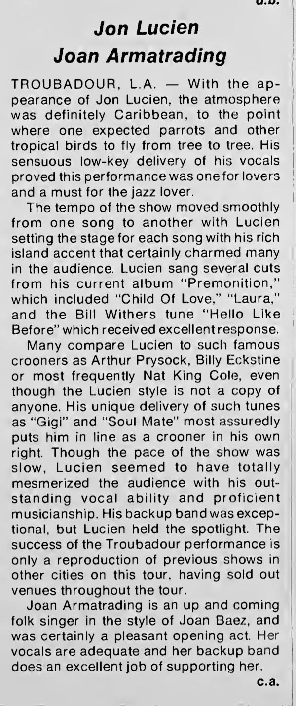 | Joan Armatrading concert review. C.A. Cash Box, 57. |