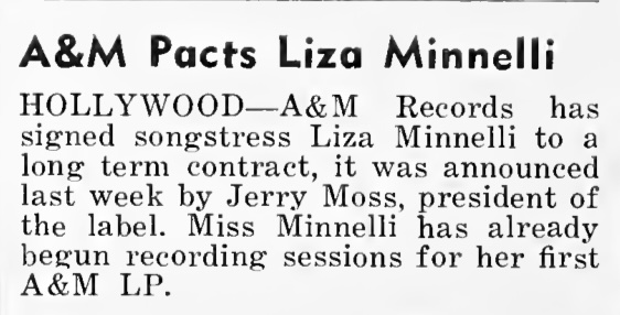 | A&M Pacts Liza Minnelli. Cash Box, 10. |