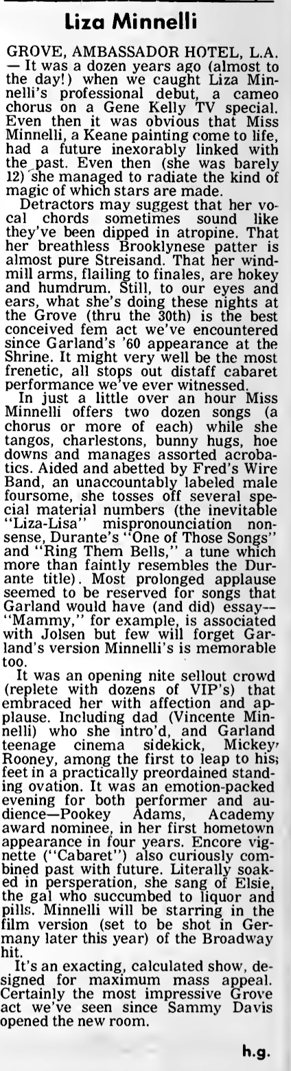 | Liza Minnelli Act Opens at Now Grove. John L. Scott. Los Angeles Times, F12. | 1970-6-17 |