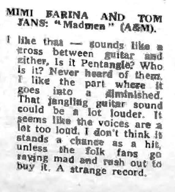 | Tom Jans and Mimi Farina Talk to Andrew Means. Melody Maker, 15. | 1971-8-14 |