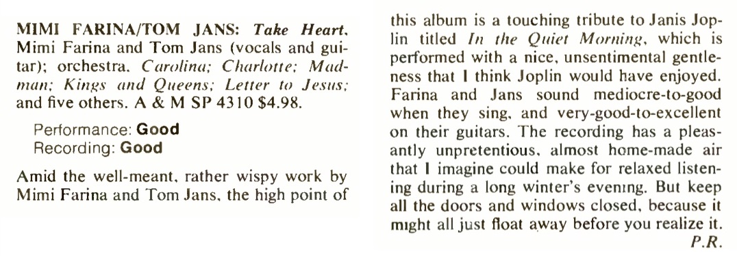 | Take Heart (SP 4310) Review. Peter Reilly. Stereo Review, 107. |