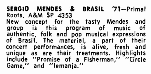 | Sergio Mendes & Brasil '77 concert review. R.A. Cash Box, 12. |