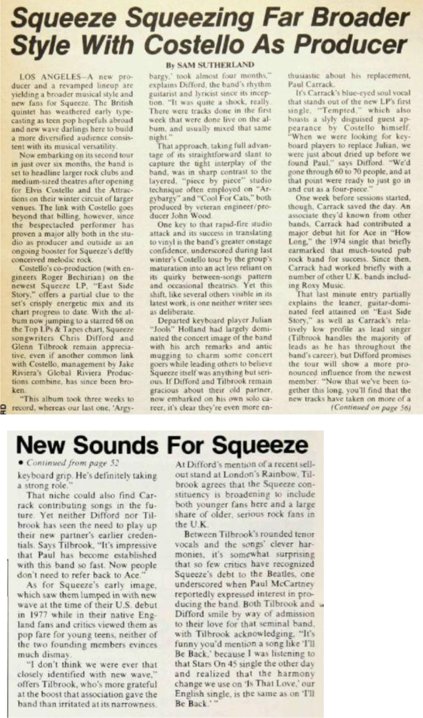 | Squeeze Squeezing Far Broader Style With Costello As Producer. Sam Sutherland. Billboard, 93:52. |