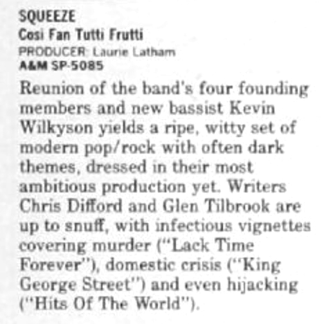 | Music: the Return of Squeeze. Ken Tucker. Philadelphia Inquirer. | 1985-8-29 |