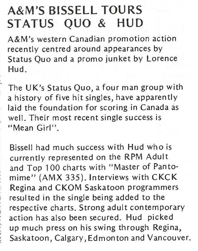 | A&M's Status Quo to Tour With Gallagher. RPM, 12. |