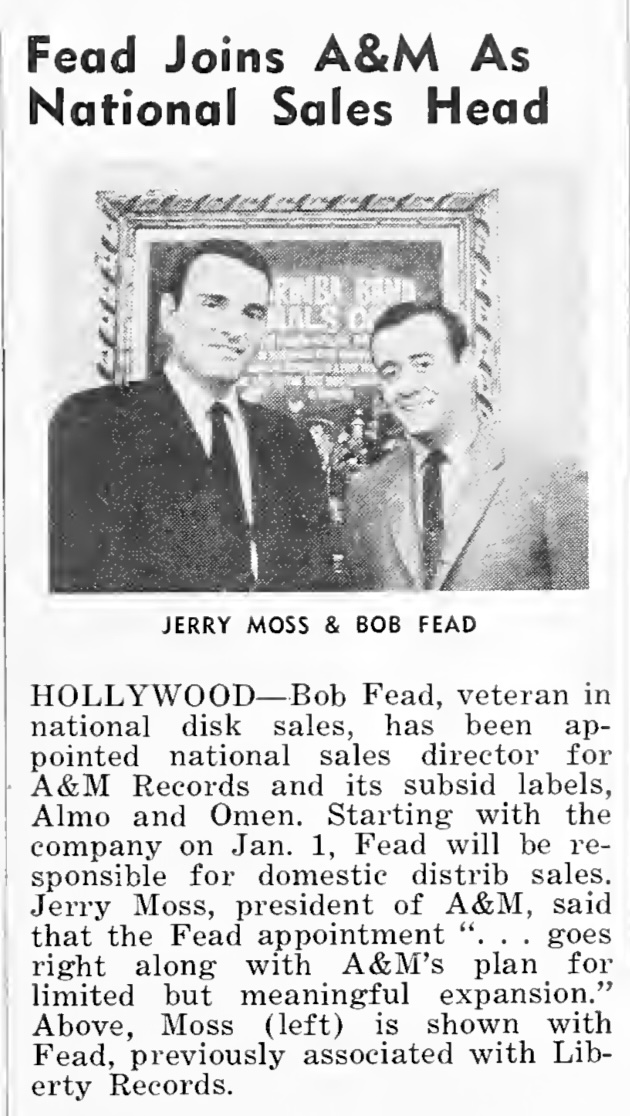 Fead Joins A&M As National Sales Head. Cash Box, 7.