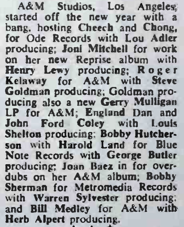 A&M Records January 1972 recording sessions. Billboard, 12.