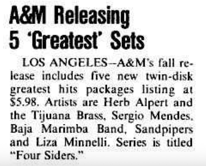 A&M Releasing 5 'Greatest Hits' Sets. Billboard, 36.