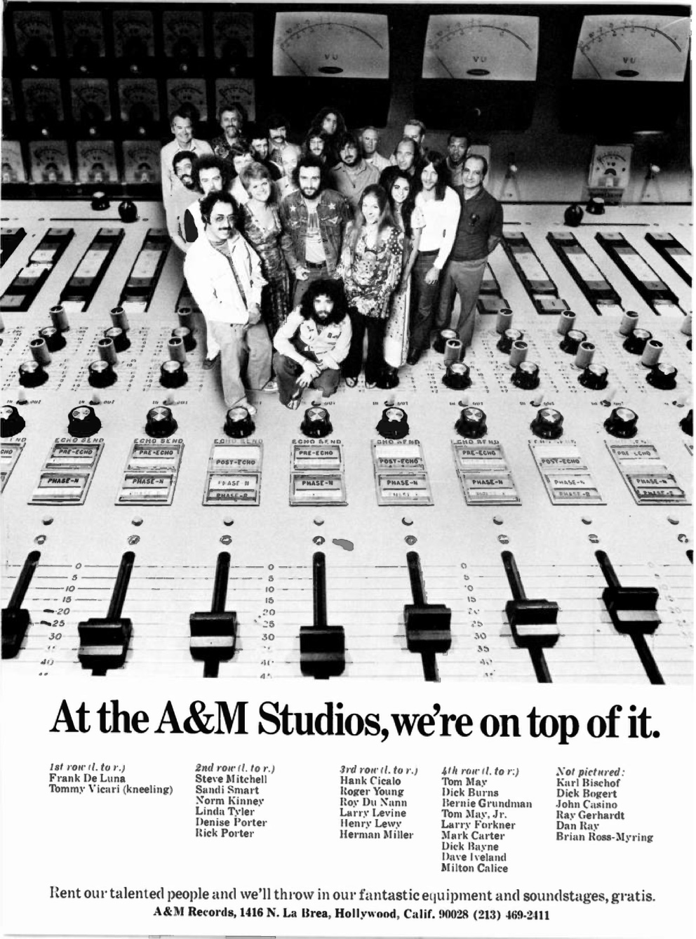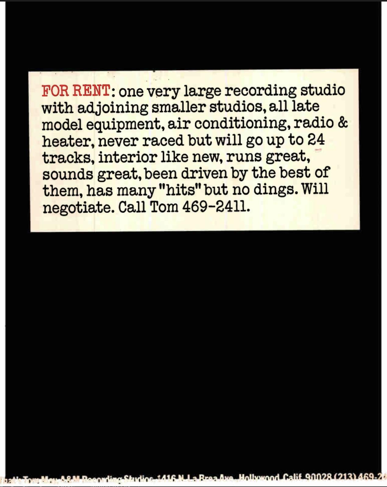 A&M told Billboard in 1970 that it had invested over $1M in upgrading the recording consoles to 16-track, opening two mastering rooms, three mixdown rooms and an echo chamber. Full services included recording, mixing, dubbing, editing, mastering. The studios were operating weekdays from 10 .m. to midnight.