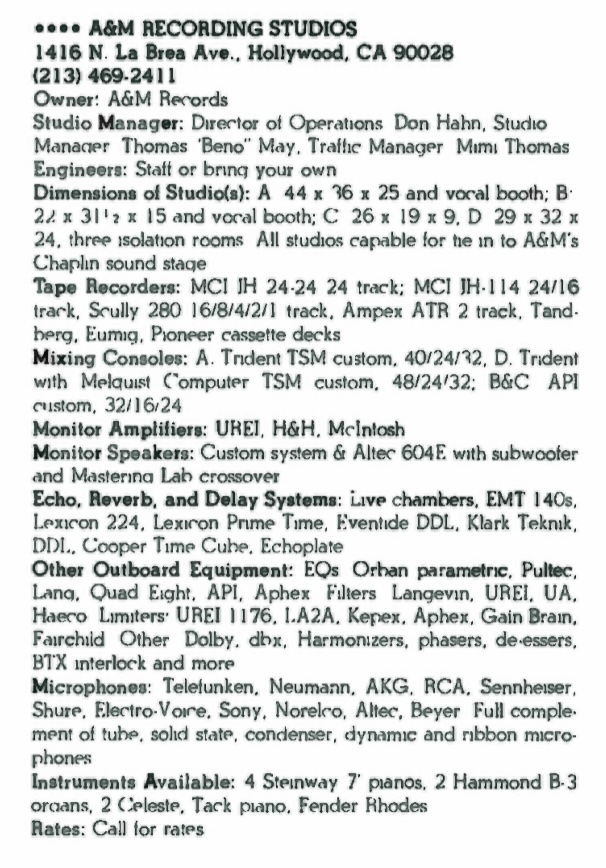 Equipment lists appeared on A&M Records web site in 1996 and in A West Coast Phenomenon the Studio That Charlie Built: Former A&M Studios, Hollywood: A state-of-the-art facility with a colorful past, and an emphasis on vintage technology by Mel Lambert, November 1997.